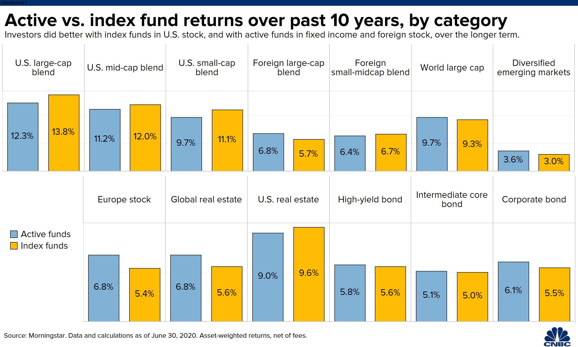 Secondo i dati di Morningstar del decennio terminato a giugno 2020, solo il 24% di tutti i fondi attivi ha battuto il proprio benchmark. Le uniche categorie di investimento che hanno visto rendimenti maggiori per i fondi attivi sono stati quelli dei corporate bond, dei fondi immobiliari globali, dei mercati emergenti e dell’azionario europeo.