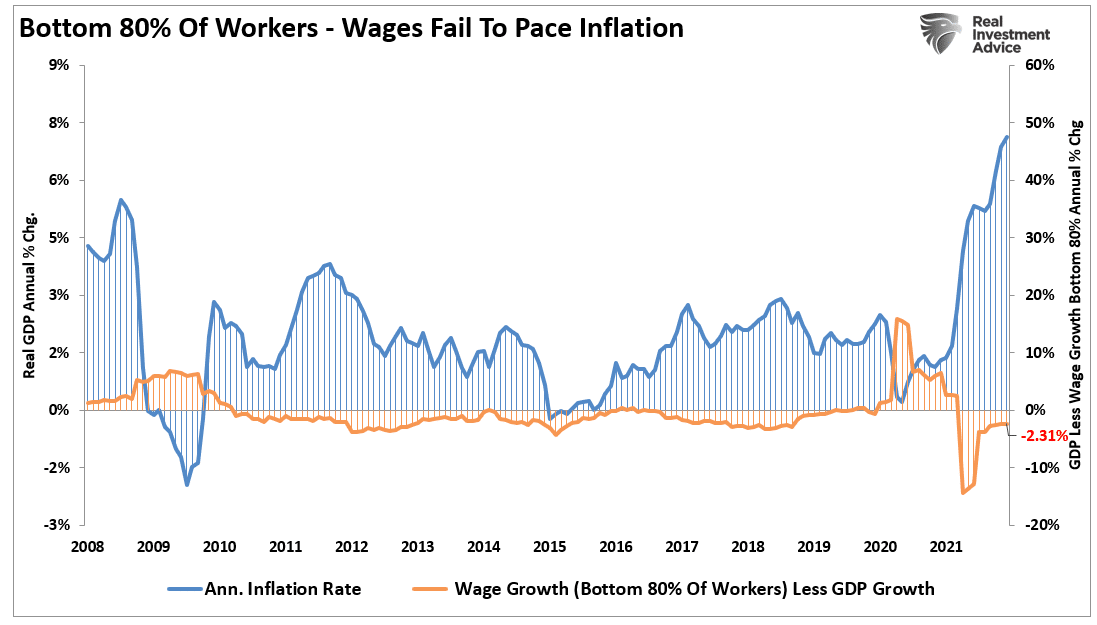 L’aumento dei salari che stiamo osservando è notevole finché non si tiene conto dell’inflazione. I salari reali per l’80% delle famiglie più povere sono negativi. In altre parole, l’aumento del loro costo della vita sta superando il loro reddito. Salari reali inferiori tendono a pesare sui consumi.