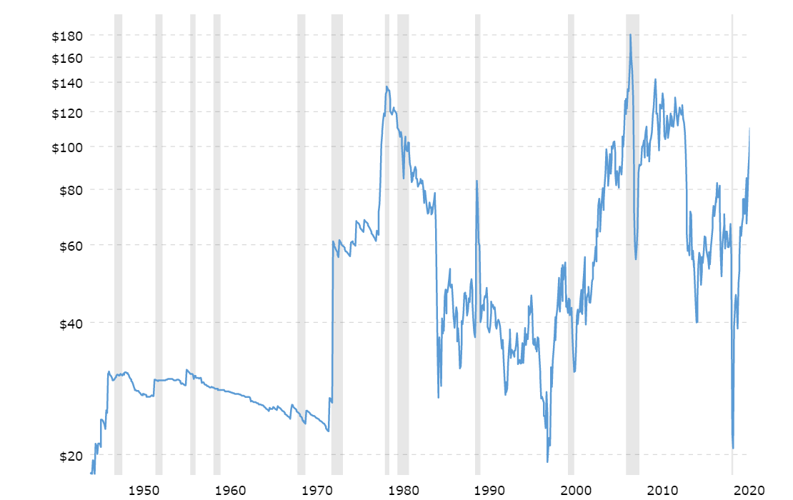 Un lungo periodo di stabilità del prezzo del petrolio è stato interrotto nel 1973. Gli anni ’70 mostrano due distinti balzi dei prezzi, uno innescato dalla guerra dello Yom Kippur nel 1973, l’altro dalla Rivoluzione iraniana del 1979. Da allora, i prezzi del petrolio sono stati molto più volatili.