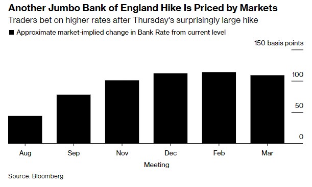Dopo l’aumento dei tassi a sorpresa della Bank of England, la sterlina ha oscillato tra guadagni e perdite mentre i gilt hanno guadagnato. Gli operatori si sono mossi per scommettere su un altro aumento di 50 punti base entro settembre. I mercati vedono ora 75 punti base di inasprimento nei prossimi due incontri e valutano una probabilità del 30% che il tasso chiave raggiungerà il picco del 6,25% entro febbraio.