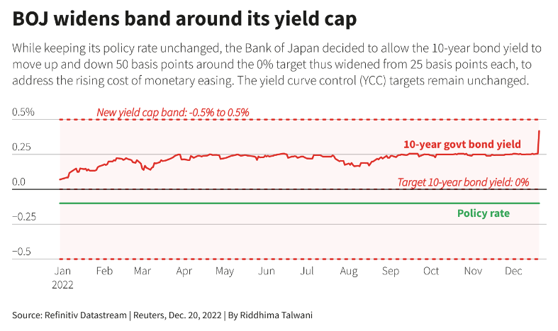 La decisione a sorpresa ha il potenziale per inviare onde d’urto attraverso i mercati finanziari globali poiché l’impegno costante della BOJ a difendere il suo limite di rendimento a 10 anni è servito da ancoraggio contribuendo indirettamente a mantenere bassi i costi di indebitamento in tutto il mondo.