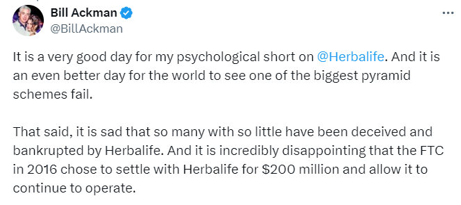 Giovedì le azioni di Herbalife sono crollate del 32% al minimo di 14 anni dopo un rapporto deludente sugli utili del quarto trimestre. Per gli azionisti è stato un giorno da dimenticare, ma non per Bill Ackman, investitore miliardario e fondatore di Pershing Square. “È un giorno molto bello per il mio short psicologico su Herbalife”, ha detto Ackman in un post su X. “Ed è un giorno ancora migliore per il mondo vedere uno dei più grandi schemi piramidali fallire”.
