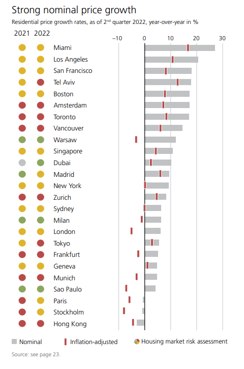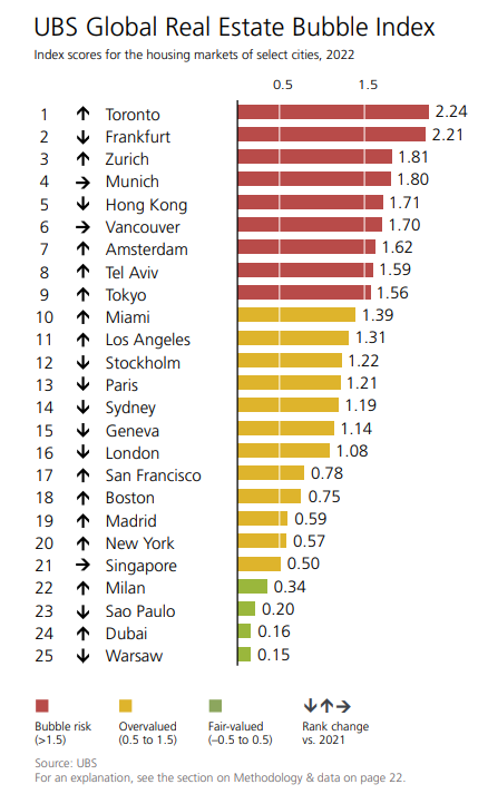 Nell’edizione 2022 del Real Estate Bubble Index di UBS, nove delle città coperte sono state classificate come a rischio estremo di bolla immobiliare, con un punteggio uguale o superiore a 1,5.
