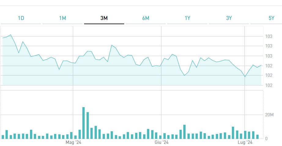 Guardando il grafico degli ultimi tre mesi, si nota che il titolo ha subito alcune fluttuazioni, mantenendosi però in un range compreso tra 102 e 103. Dopo un picco iniziale, il prezzo ha visto una fase di consolidamento, con un lieve calo a maggio seguito da un rialzo a giugno. Questo comportamento riflette l’incertezza e le aspettative degli investitori in risposta alle recenti mosse della BCE.