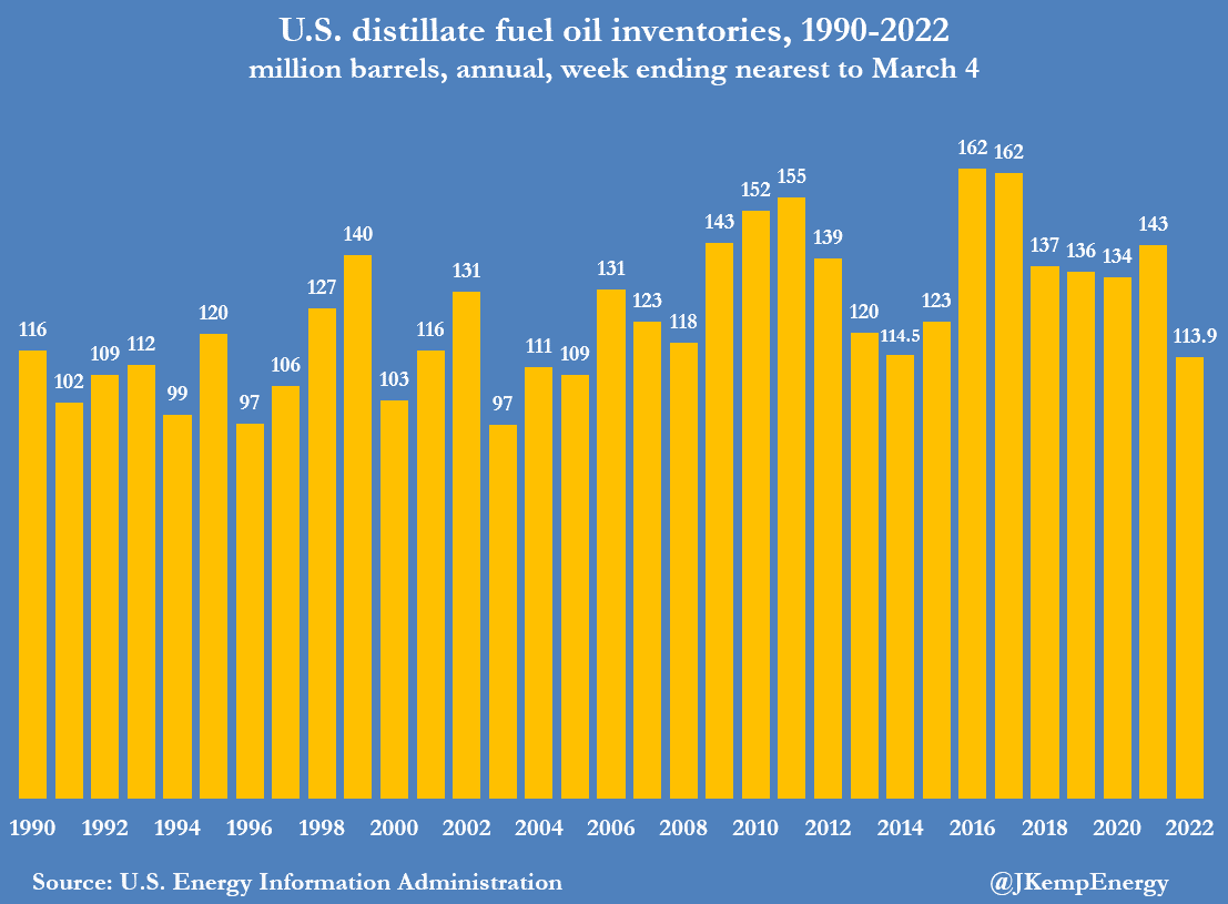 Già prima della guerra, le scorte di diesel erano scese a livelli pericolosamente bassi, in particolare negli Stati Uniti e nell’hub petrolifero europeo di Anversa, Rotterdam e Amsterdam (ARA). Nella regione europea le scorte sono al minimo stagionale di 14 anni fa.