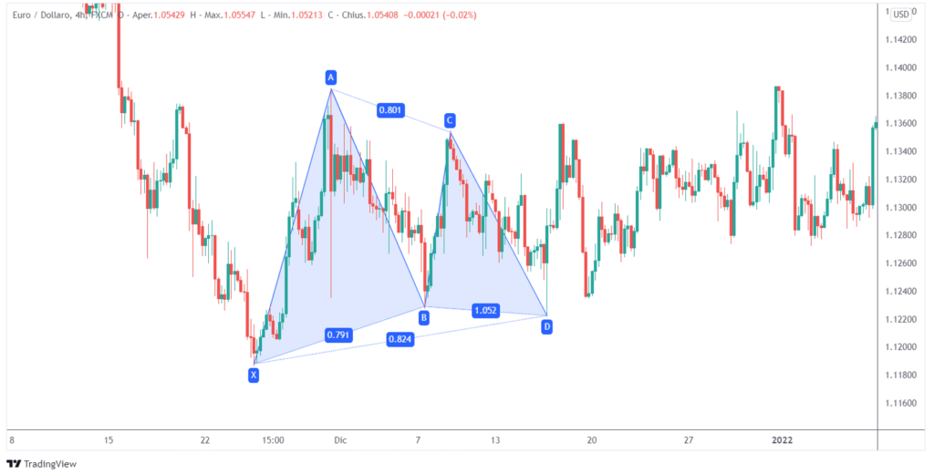 La gamba BC ripercorrendo l’intervallo tra il 38,2% e l’88,6% della gamba AB. La gamba CD è l’ultima gamba ed è anche la più significativa. Essa si arriva almeno all’estensione del 127,2 della gamba CD. I trader aspettano di entrare fino alla formazione del punto D del pattern.