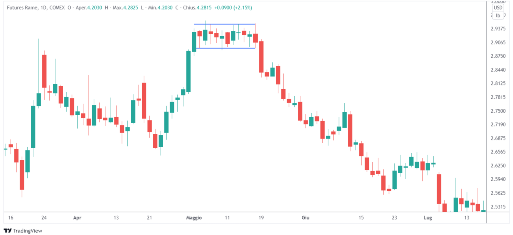 Il rettangolo è un pattern di analisi tecnica composto da linee orizzontali che mostrano un supporto e una resistenza significativi. Il rettangolo descrive un momento in cui domanda e offerta sono in equilibrio approssimativo. Il prezzo si muove in un intervallo ristretto tra la resistenza e il supporto che formano il triangolo. E’ un modello che mostra l’indecisione dei trader, in cui la forza dei buyers e quella dei sellers è approssimativamente uguale.