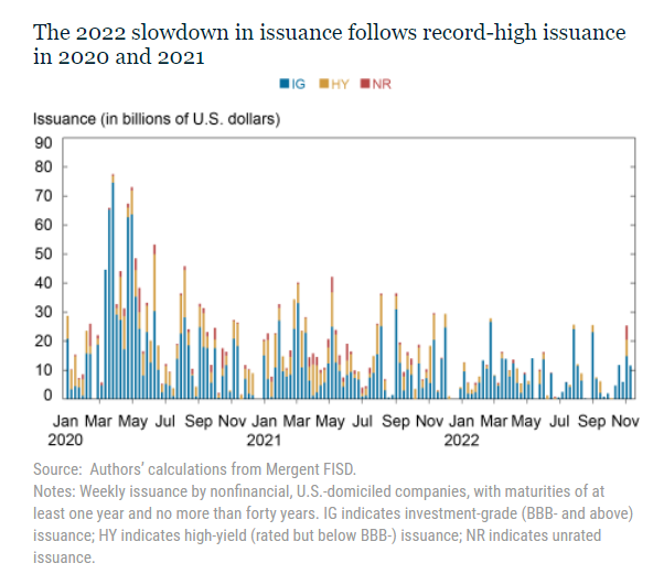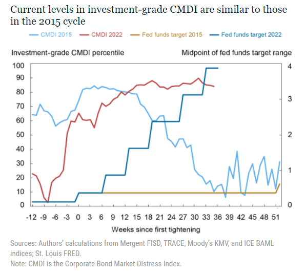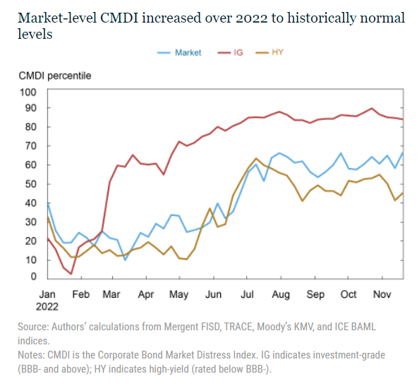 Per esaminare l’evoluzione dello stress del mercato delle obbligazioni societarie mentre la Fed continua con gli aumenti dei tassi d’interesse, prendiamo come riferimento il Corporate Bond Market Distress Index (CMDI), una misura unificata che quantifica le dislocazioni congiunte nei mercati primari e secondari delle obbligazioni societarie.