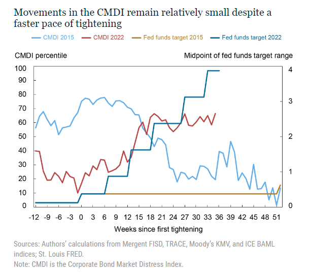 Nel corso di quest’anno, il FOMC ha inasprito la politica monetaria a un ritmo storicamente rapido. È quindi istruttivo confrontare l’evoluzione del CMDI durante l’attuale ciclo di inasprimento con il ciclo precedente iniziato nel dicembre del 2015.