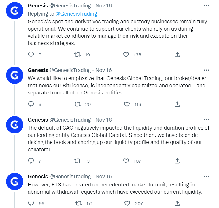 Le ripercussioni del crollo di FTX e il relativo rischio di contagio mostrano pochi segni di allentamento. La società di intermediazione di asset digitali Genesis sta lottando per raccogliere denaro per la sua unità di prestito e avverte gli investitori che potrebbe dover dichiarare bancarotta se i suoi sforzi fallissero.