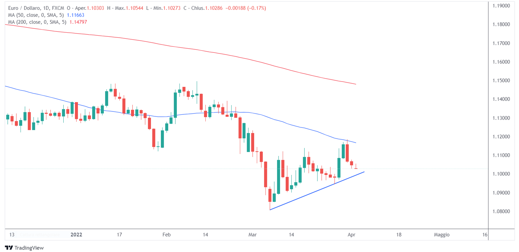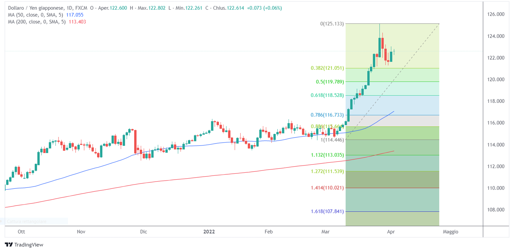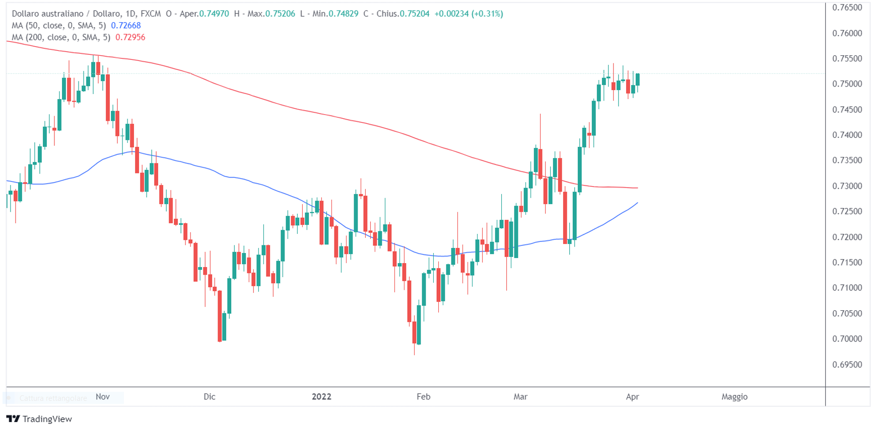 Chi invece sta mostrando forza nei confronti del dollaro è senz’altro l’aussie. L’Australia infatti sta beneficiando dello sforzo di vari paesi per sostituire il gas ed il petrolio russo e dalla forza delle materie prime. AUD/USD ha rotto con decisione la media a 200 periodi e si trova al momento in una piccola fase di congestione.