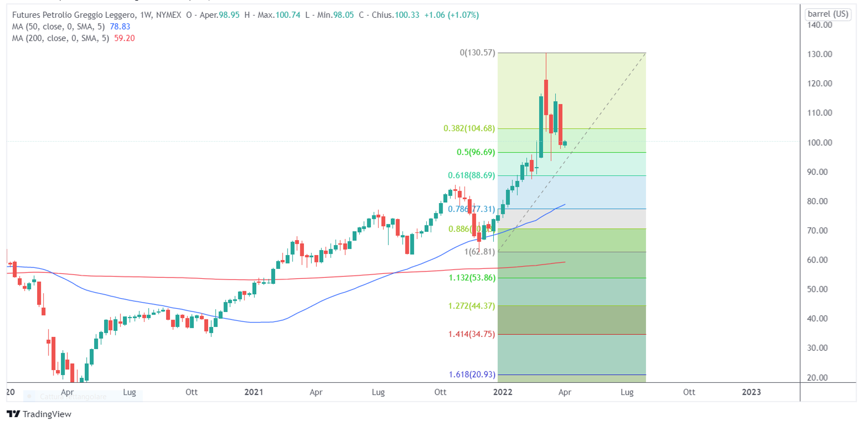 Il petrolio ha risposto perdendo più del 12% nella settimana appena conclusa e ha chiuso sotto i 100 $. Su timeframe settimanale, il prezzo si trova tra il livello 38.2 e 50 del ritracciamento di Fibonacci dell’ultimo impulso rialzista e la distanza dalla media a 50 periodi è ancora molto ampia.