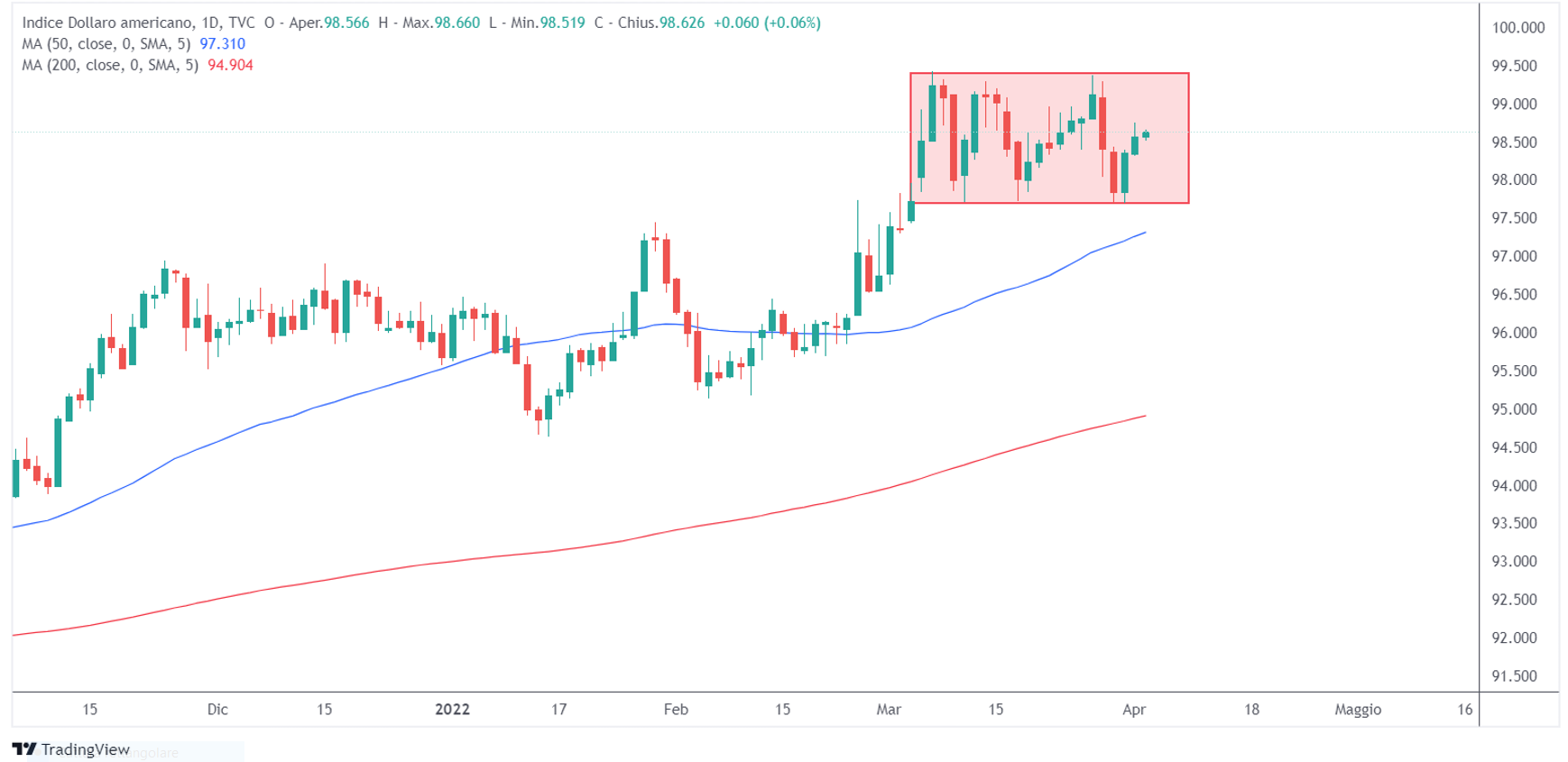 Il dollaro americano sta scambiando in un range di trading ben definito. Il prezzo sta reagendo in maniera quasi telecomandata sia alla resistenza a 99.30 che al supporto a 97.70.