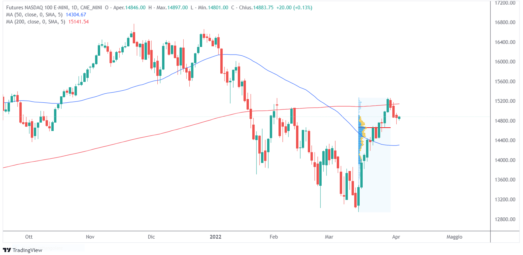 Il Nasdaq è nella “terra di nessuno”. Il prezzo, dopo aver usato la media a 200 periodi come resistenza, si trova tra la media a 50 e 200 periodi ed è vicino al poc dell’ultimo impulso rialzista.