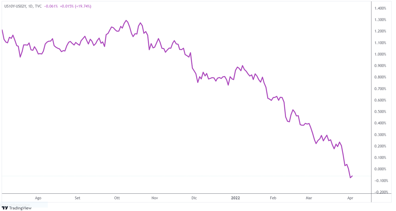 Il segnale anticipatore delle recessioni più usato dagli investitori ha mostrato la luce rossa. Ebbene si! Lo spread tra i rendimenti delle obbligazioni a 10 anni e a 2 anni è passato in territorio negativo, unendosi a molti altri segmenti della curva dei rendimenti che sono già invertiti.
