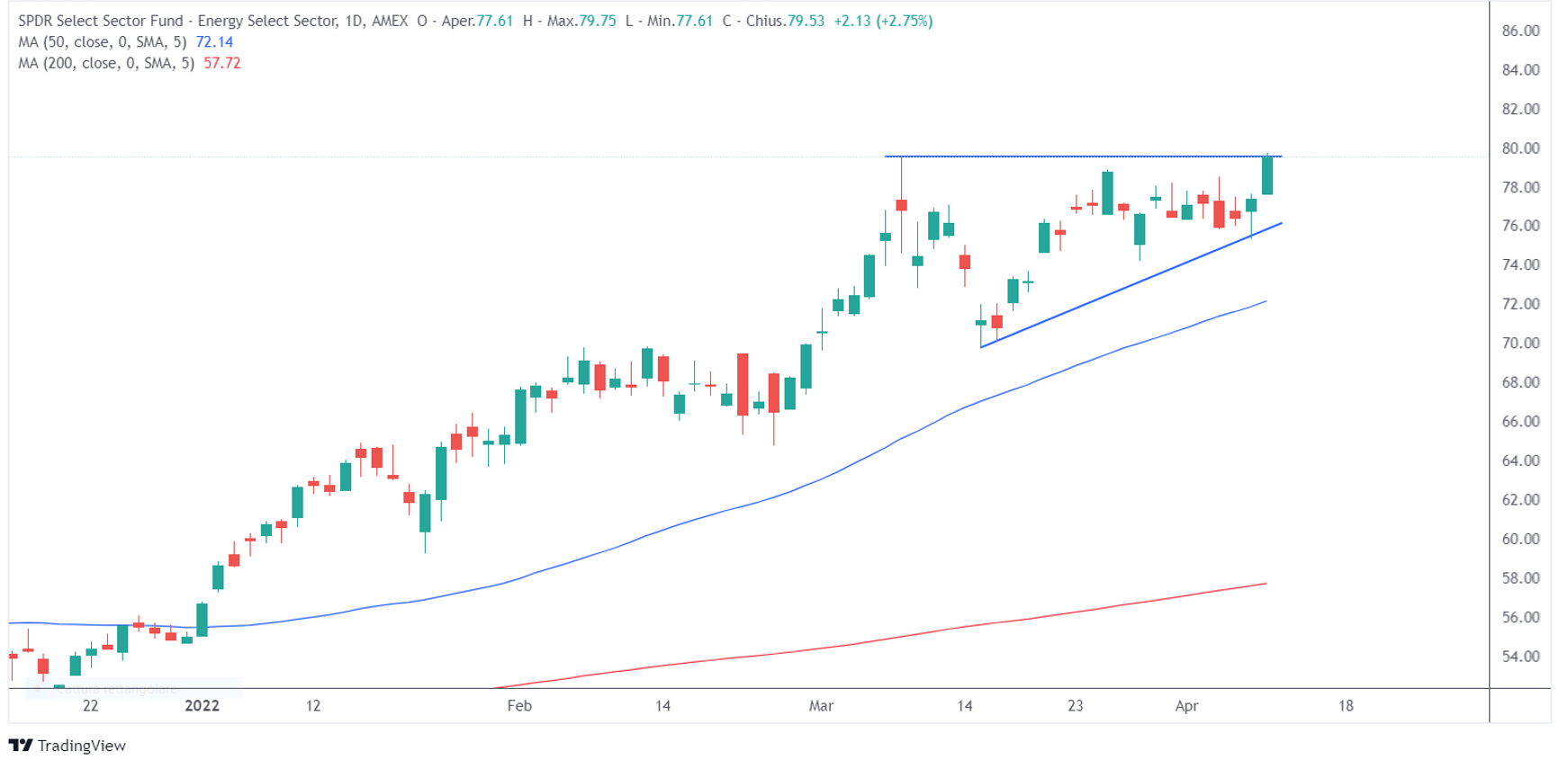 XLE, dopo aver consolidato per qualche settimana (complice anche il ritracciamento del petrolio), sembra che stia per rompere un piccolo triangolo ascendente. Il trend rimane fortemente rialzista e la distanza con la media a 200 periodi è molto ampia.