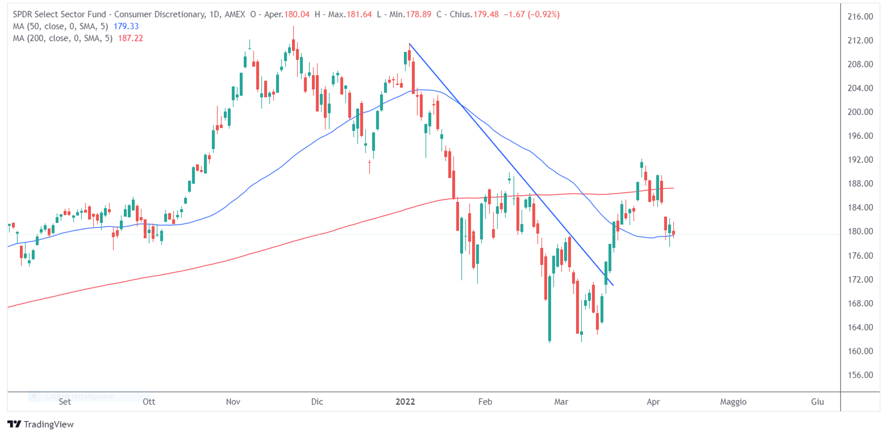 L’ETF XLY ha recuperato le perdite di inizio conflitto così come il mercato più ampio. Dopo aver rotto una trendline dinamica al rialzo, il prezzo si è portato al di sopra della media a 50 periodi per poi lateralizzare su quella a 200, sulla quale ha reagito.