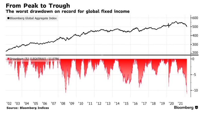 Le obbligazioni continuano a fare da protagoniste. Il sell off obbligazionario globale sembra non avere fine, con l’indice aggregato di Bloomberg delle obbligazioni globali che ha registrato il peggior drawdown di sempre.