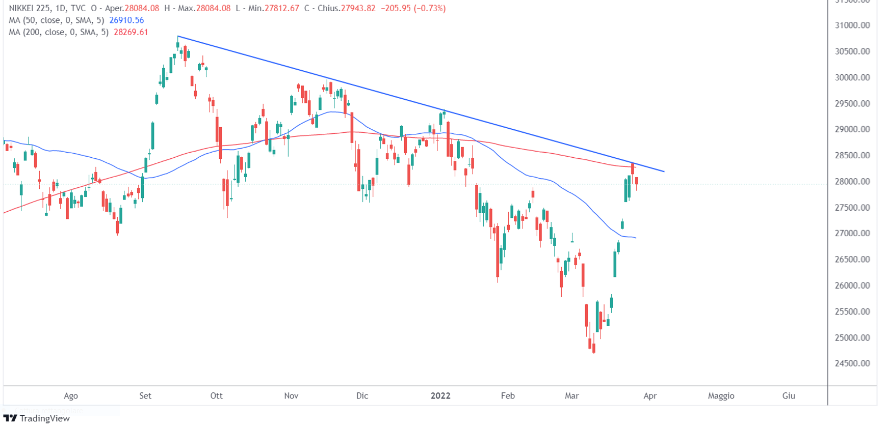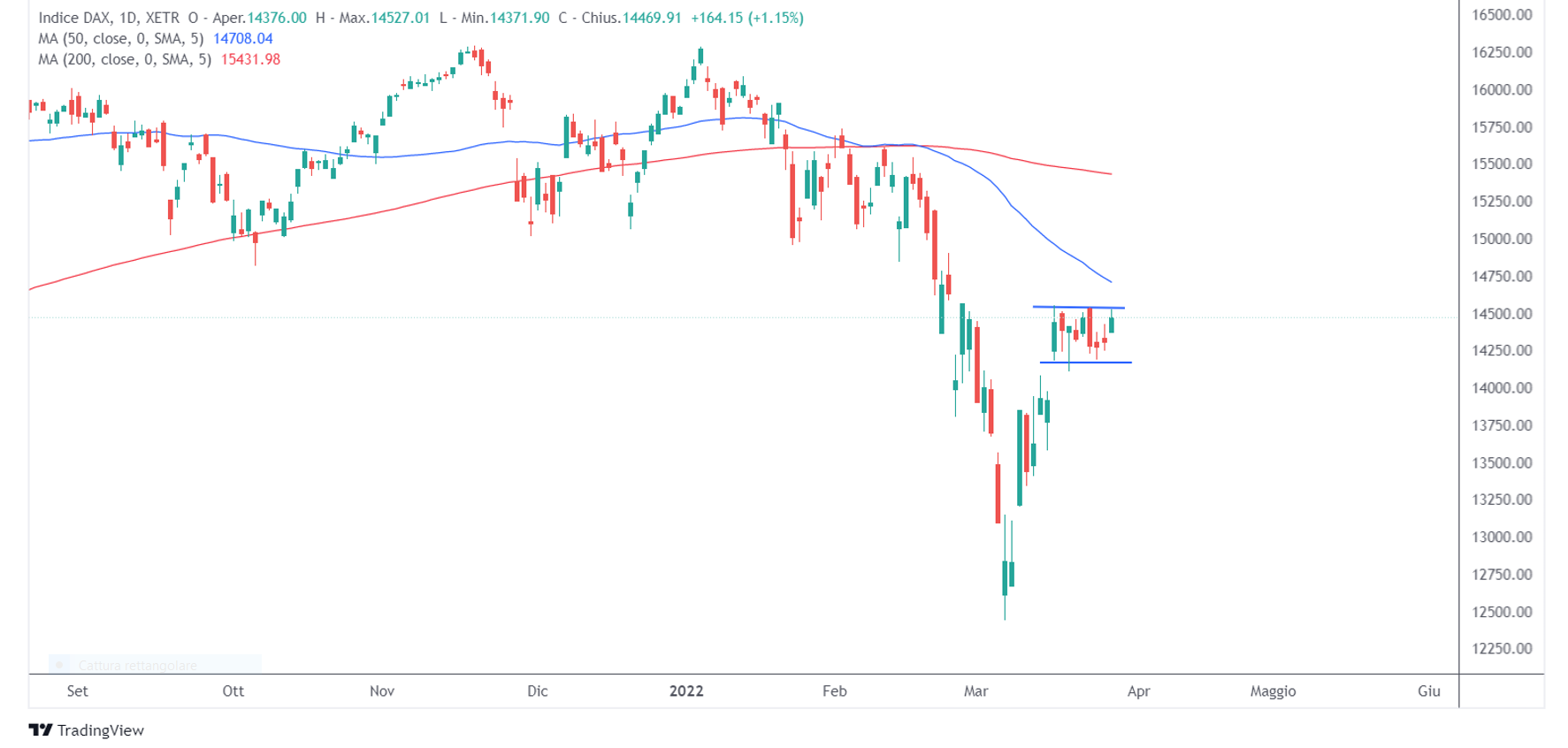In altre regioni i mercati sono stati molto più fiacchi. Il DAX in Germania ha chiuso in negativo. Dopo il forte impulso rialzista dai minimi del 7 marzo, l’indice tedesco sembra essersi preso una pausa. Il prezzo, che si trova ancora al di sotto della media mobile a 50 periodi, sta comprimendo in attesa del prossimo movimento.