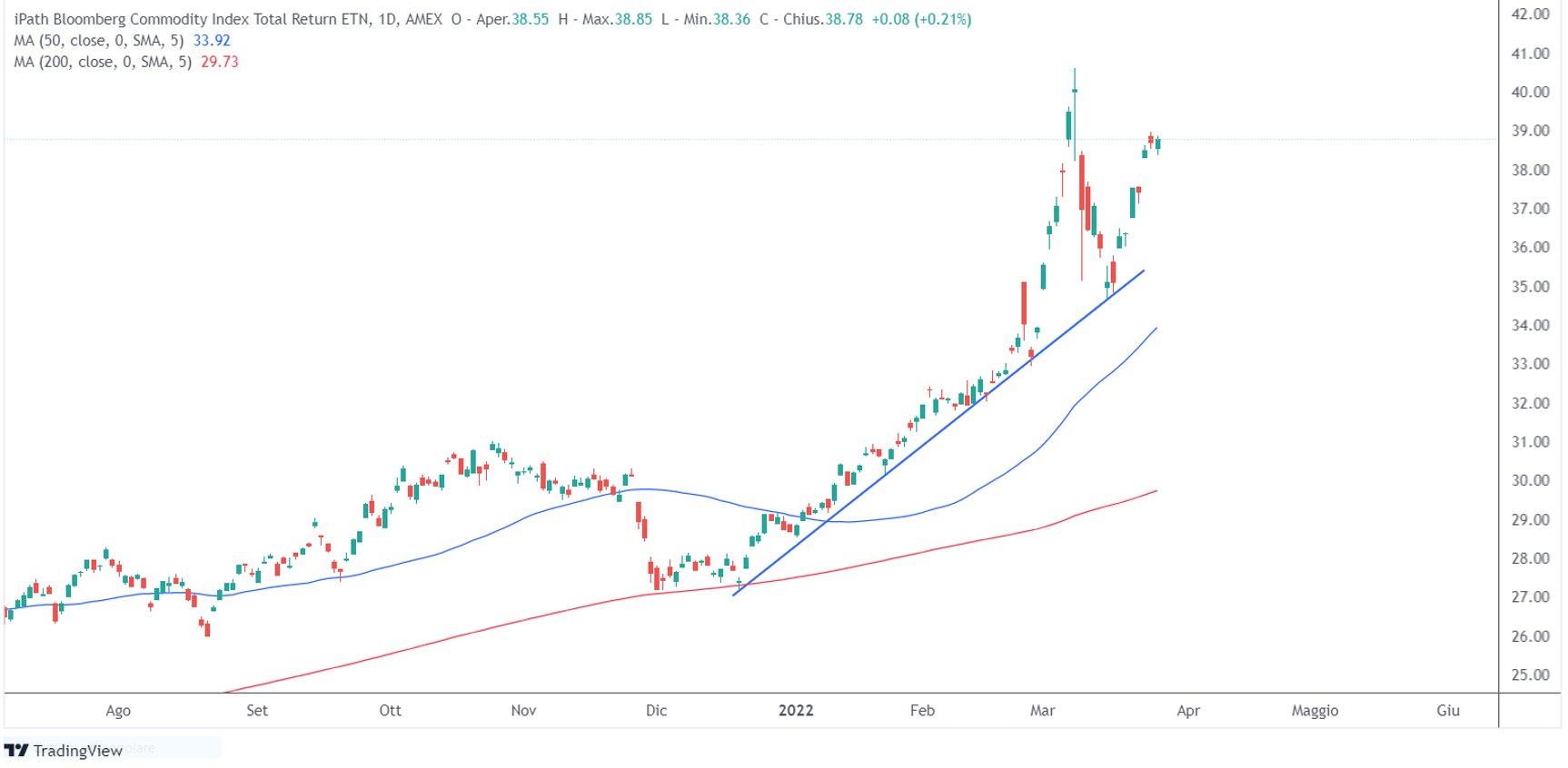 Dopo la recente correzione, l’indice DJP di Bloomberg sta procedendo al rialzo. Il ritracciamento non è riuscito ad arrivare nemmeno al livello 50 di Fibonacci che il prezzo è subito rimbalzato usando una trendline dinamica come supporto. La distanza dalla media a 200 periodi è molto ampia e il trend rimane fortemente rialzista.