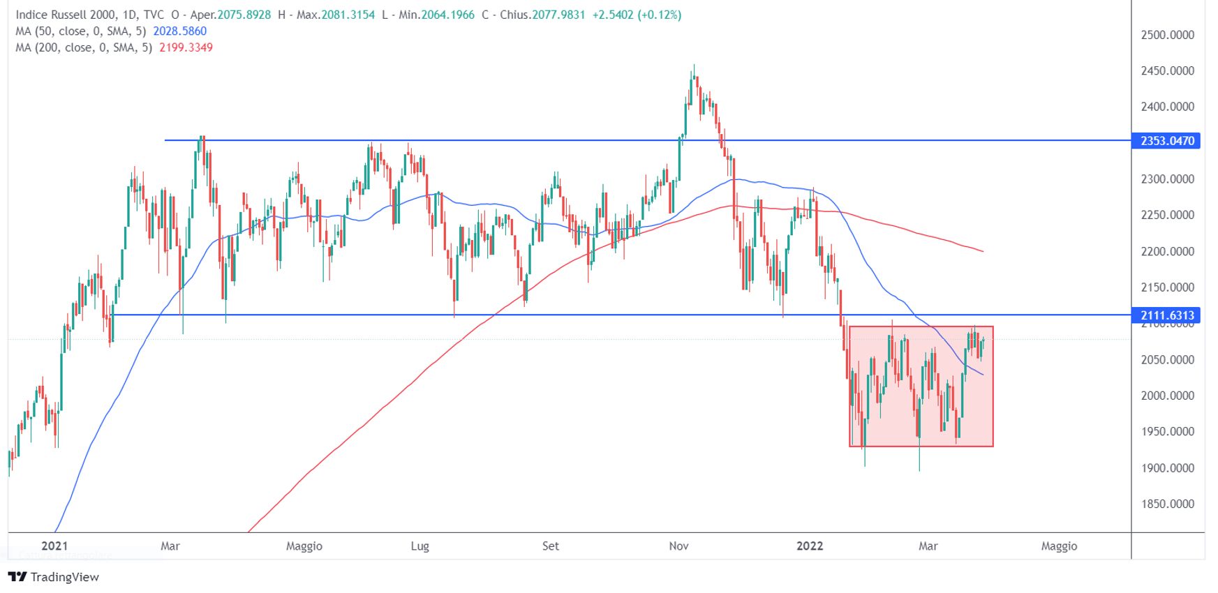A gennaio il Russell, dopo aver rotto un supporto importante, era scivolato in un bear market toccando un minimo il 28 gennaio. Da lì il prezzo è rimasto all’interno di un range ristretto in cui sta continuando a consolidare. L’indice si trova a più del 15% dai suoi massimi storici.