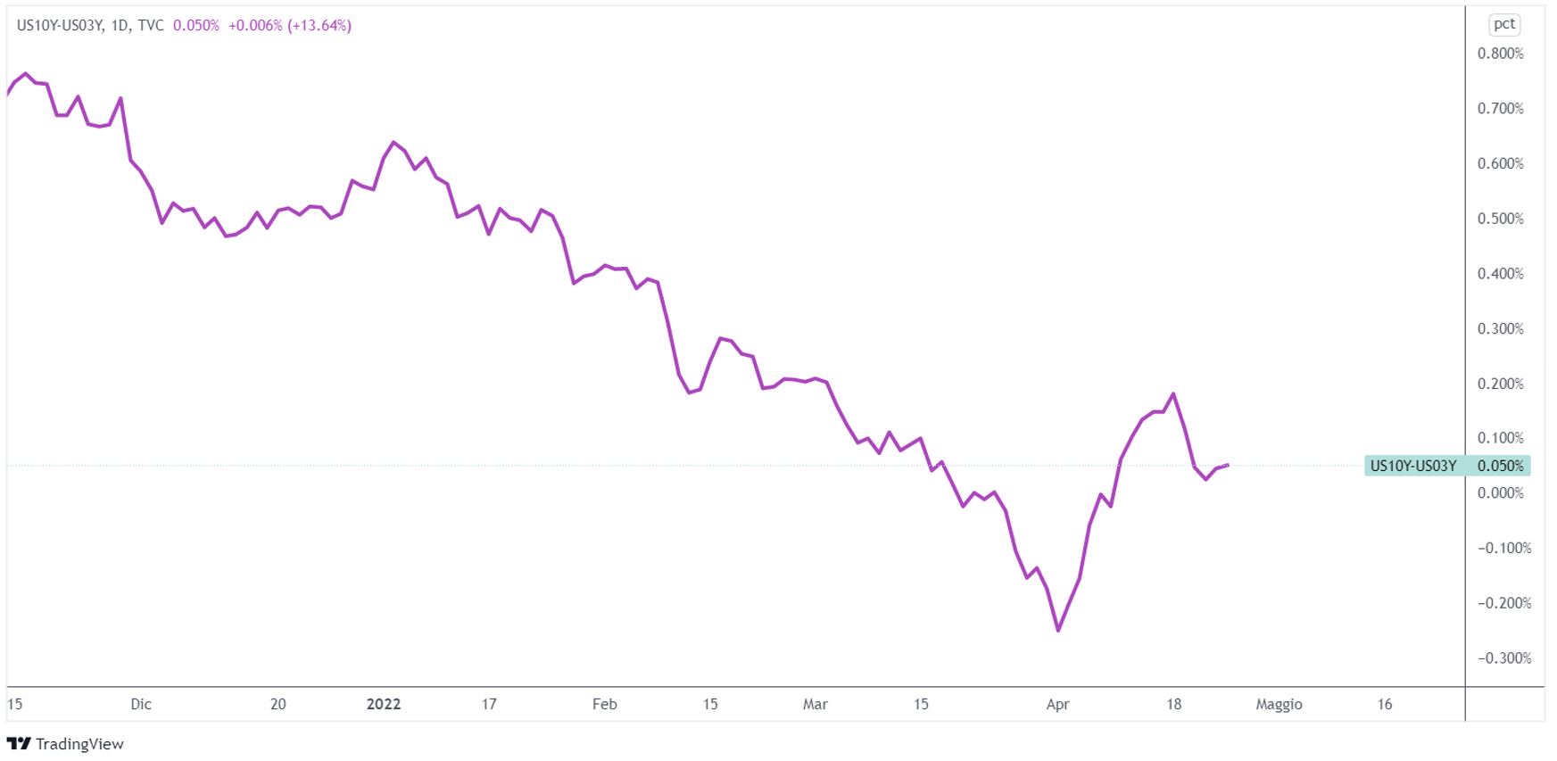 La curva dei rendimenti si è invertita di nuovo. Lo spread tra i rendimenti a 10 anni e quelli a 3 è tornato brevemente in territorio negativo.