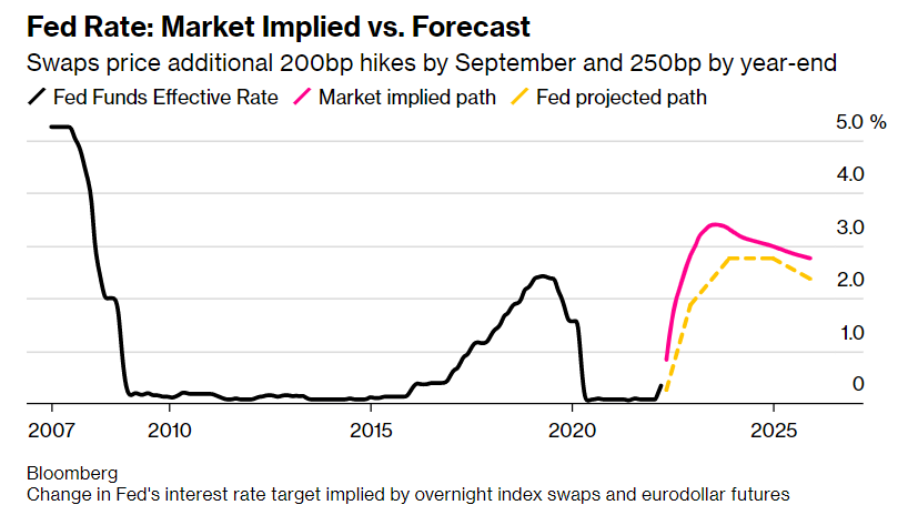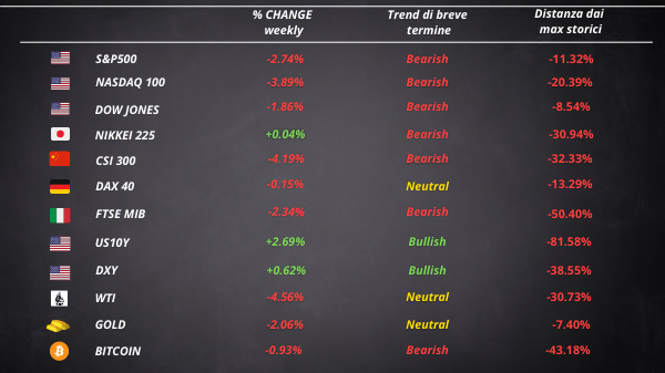 E’ stata una settimana difficile per le azioni americane. Le aziende tecnologiche sono state le più colpite dalla crescita delle aspettative sugli aumenti dei tassi d’interesse della Fed. Powell pensa che sia necessario muoversi più velocemente per fermare l’inflazione più alta degli ultimi 40 anni. A seguito dell’intervento del governatore della Fed al panel del Fondo Monetario Internazionale, il mercato ha iniziato a scontare tre aumenti di 50 punti base entro la fine dell’anno.