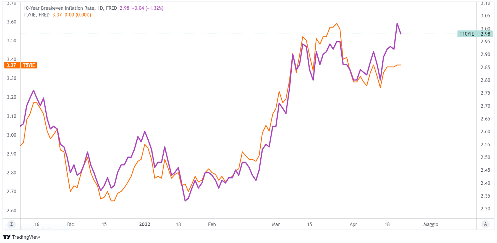 Nonostante il mercato stia scontando un ciclo di inasprimento più aggressivo, le aspettative di inflazione a 10 anni misurate con i tassi di pareggio sono continuate ad aumentare (2.98%) mentre quelle a 5 sono rimaste piatte (3.37%).