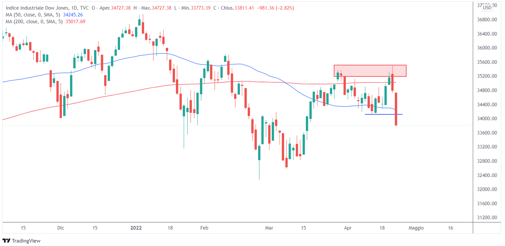 Il Nasdaq è stato l’indice con le peggiori performance settimanali e ha superato di nuovo la soglia del bear market, trovandosi a più del 20% dai suoi massimi storici. Con la candela dell’11 aprile, il prezzo ha rotto al ribasso la media mobile a 50 periodi e, dopo una breve fase laterale, ha continuato al ribasso dando un segnale bearish di breve termine.
