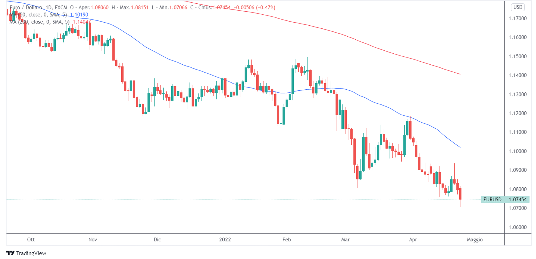 Il trend ribassista dell’euro sembra inarrestabile. La valuta comune sta scambiando sotto la soglia psicologica degli 1.08 e si trova al livello più basso da maggio 2020.