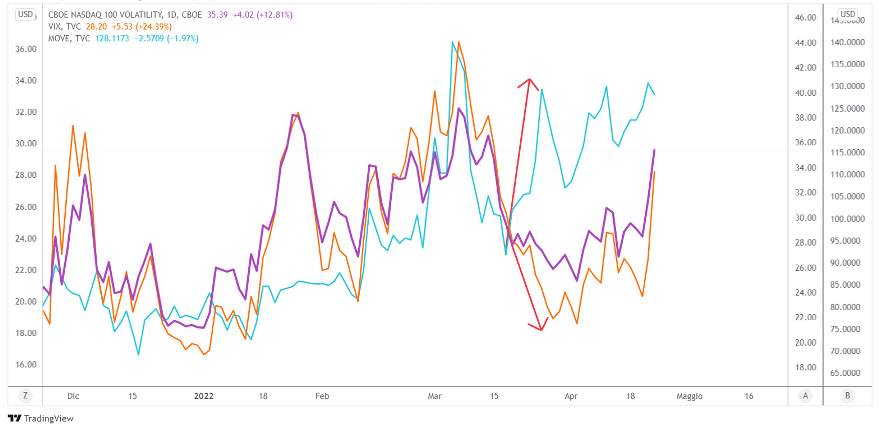 Il VIX è vicino ai 30 punti mentre il VXN ha chiuso la settimana sopra i 35, scontando il ritorno del nervosismo e la fine del compiacimento dei mercati. In un certo senso possiamo dire che la volatilità dell’azionario si è aggiustata allo stress del mercato obbligazionario. A metà marzo infatti si era creata una divergenza tra l’indice MOVE, che continuava a salire, e le volatilità VIX e VXN, che invece stavano scendendo. Adesso il divario si sta correggendo.