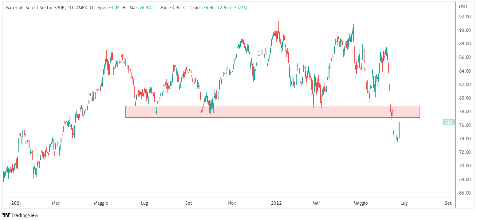 Sotto la superficie permane comunque l’incertezza per le prospettive di crescita, poiché i titoli economicamente sensibili come i produttori di materie prime e gli industriali hanno ottenuto i risultati meno brillanti. L’ETF del settore dei materiali ha rotto al ribasso un’area importante che sembrerebbe voler ritornare a testare, magari per continuare al ribasso.