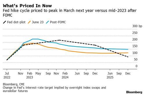Il mercato pensa che la Fed terminerà il suo ciclo di rialzi prima di quanto scontato in precedenza. Al momento, stanno scontando una probabilità del 71% di un aumento dei tassi di 75 punti base a luglio mentre le aspettative sugli aumenti a dicembre e febbraio sono crollate.