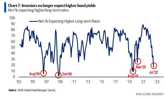 La percentuale di gestori di fondi che si aspetta rendimenti obbligazionari più alti è scesa al minimo in 3 anni, mentre la percentuale che si aspetta tassi a breve termine più alti sta scendendo velocemente.