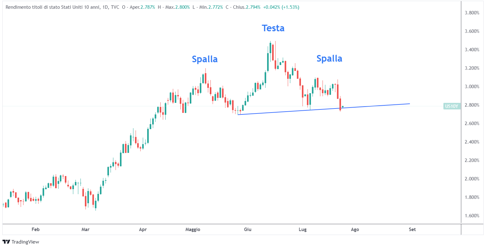 In queste informazioni è incorporato il pensiero che l’economia non resisterà all’inasprimento monetario della Fed e che probabilmente, ad un certo punto, l’inflazione dovrà scendere e riadattarsi a condizioni economiche più deboli. Il recente comportamento del decennale, sembra essere in linea con tutto ciò. Dal grafico si può notare la formazione di un testa e spalle d’inversione.