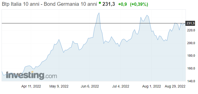 Dopo l’ultimo aumento dei tassi della BCE, lo spread BTP-Bund ha superato i 230 punti base e si trova vicino al massimo di giugno, quando la Lagarde ha convocato una riunione di emergenza per discutere dei rischi per i paesi più fragili dell’Euro Area.