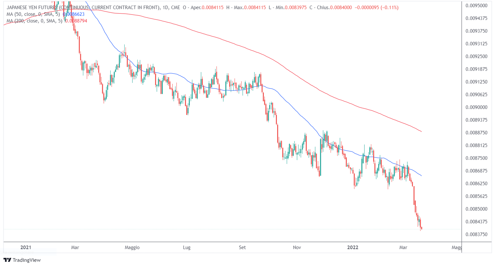 La Bank of Japan ha lasciato i tassi invariati come previsto, indicando una crescente preoccupazione per l’economia. L’inflazione in Giappone rimane contenuta nonostante l’aumento dei costi energetici. Lo yen è in un trend ribassista dall’anno scorso e questa settimana ha rotto i minimi del 2017. Il prezzo ha spesso usato la media a 50 periodi come resistenza. Al momento è molto lontano dalla media a 200 periodi e una sorta di mean reversion potrebbe non essere improbabile. Tuttavia il trend è nettamente al ribasso.