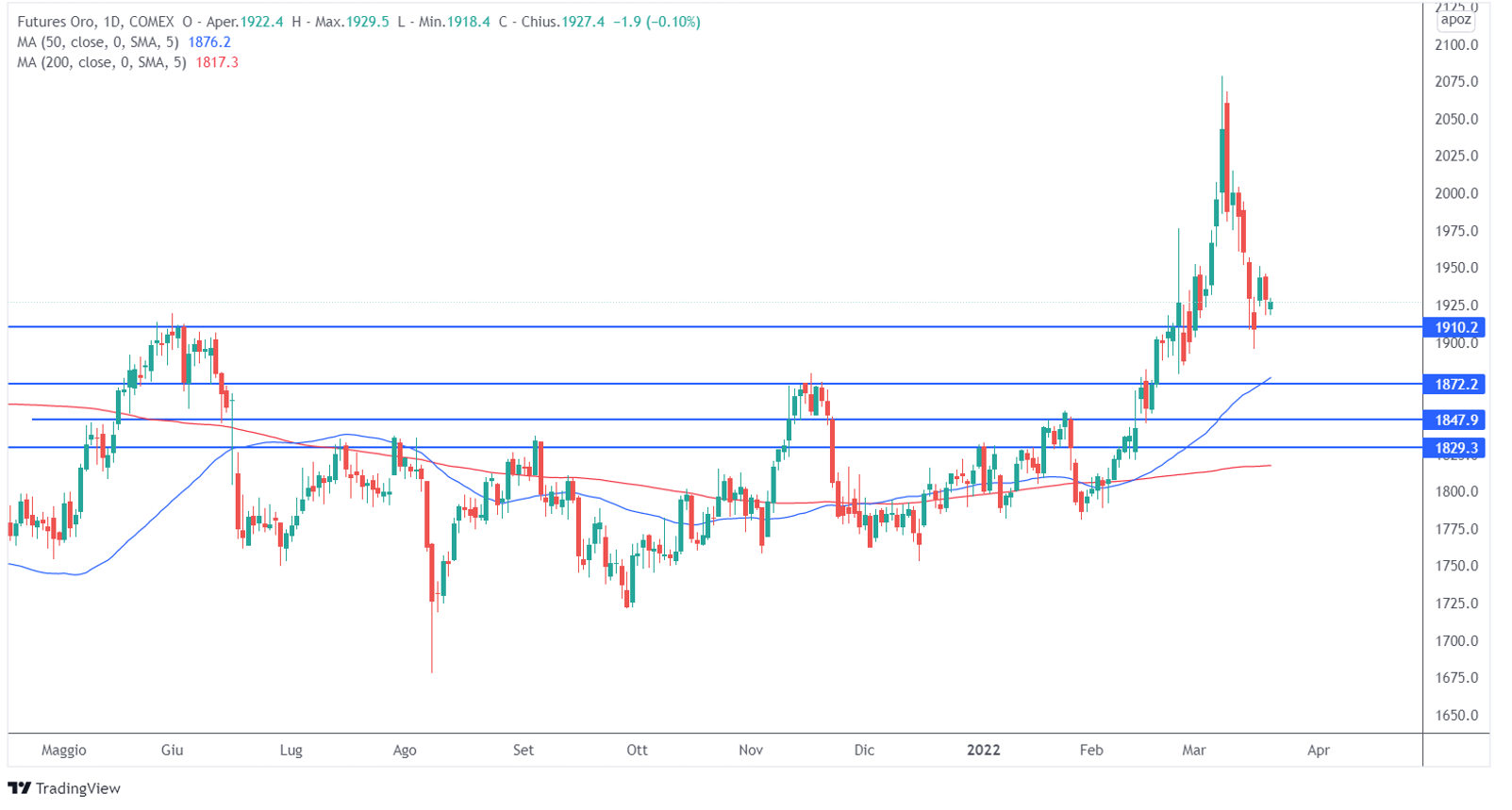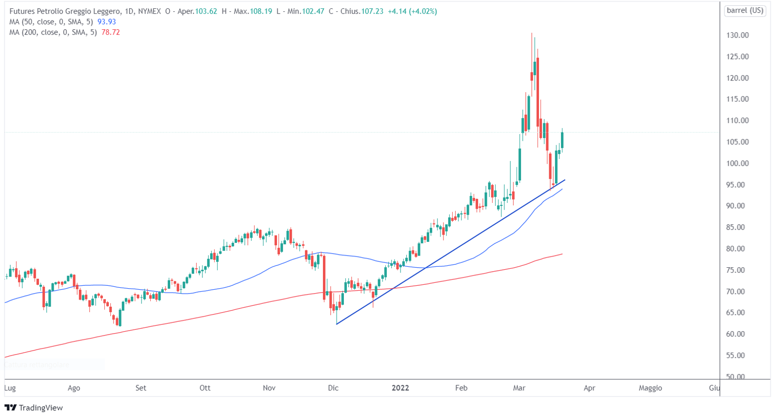 Le trattative tra Russia e Ucraina sono servite anche a placare i rally delle materie prime. Il petrolio ha ritracciato del 28% dai massimi a 130 $ ma ha recuperato parte delle perdite gli ultimi giorni della settimana. La distanza dalla media a 200 periodi è ancora ampia. Il prezzo si trova al di sopra di una trendline dinamica che tiene il prezzo da dicembre 2021.
