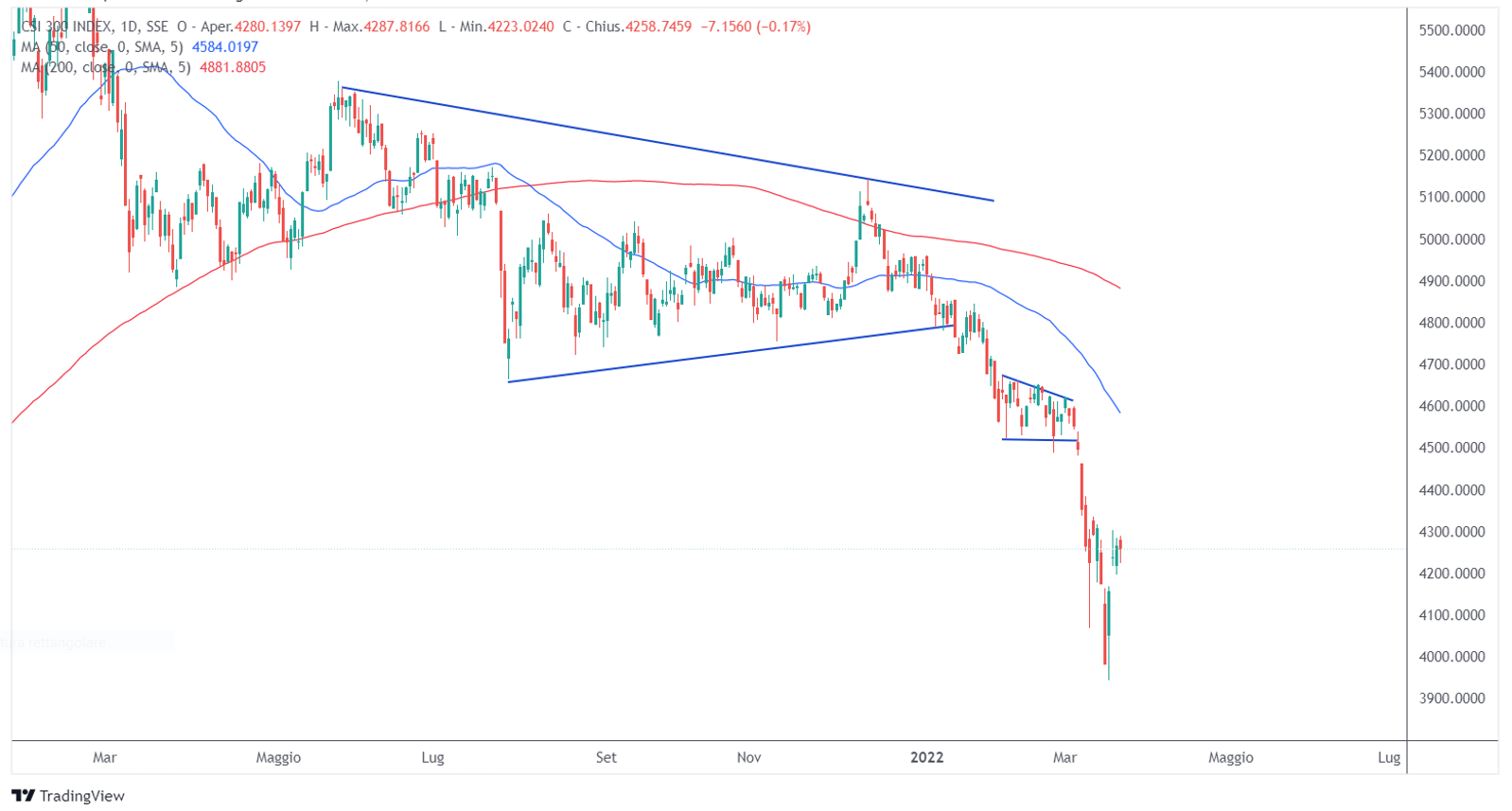 Il CSI 300 mercoledì stava perdendo più del 2.5% e ha chiuso infine al +4.32%. Il prezzo si trova ancora lontano dalla media a 50 periodi.