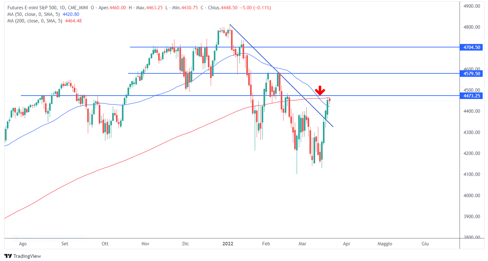Anche il Nasdaq, l’indice che ha subito di più il sell-off di quest’anno, ha visto un rimbalzo simile a quello dell’S&P. Il prezzo si trova in prossimità della media a 50 periodi. Con l’invasione russa dell’Ucraina, l’indice era entrato ufficialmente in un bear market. Stiamo quindi assistendo a un bear market rally?