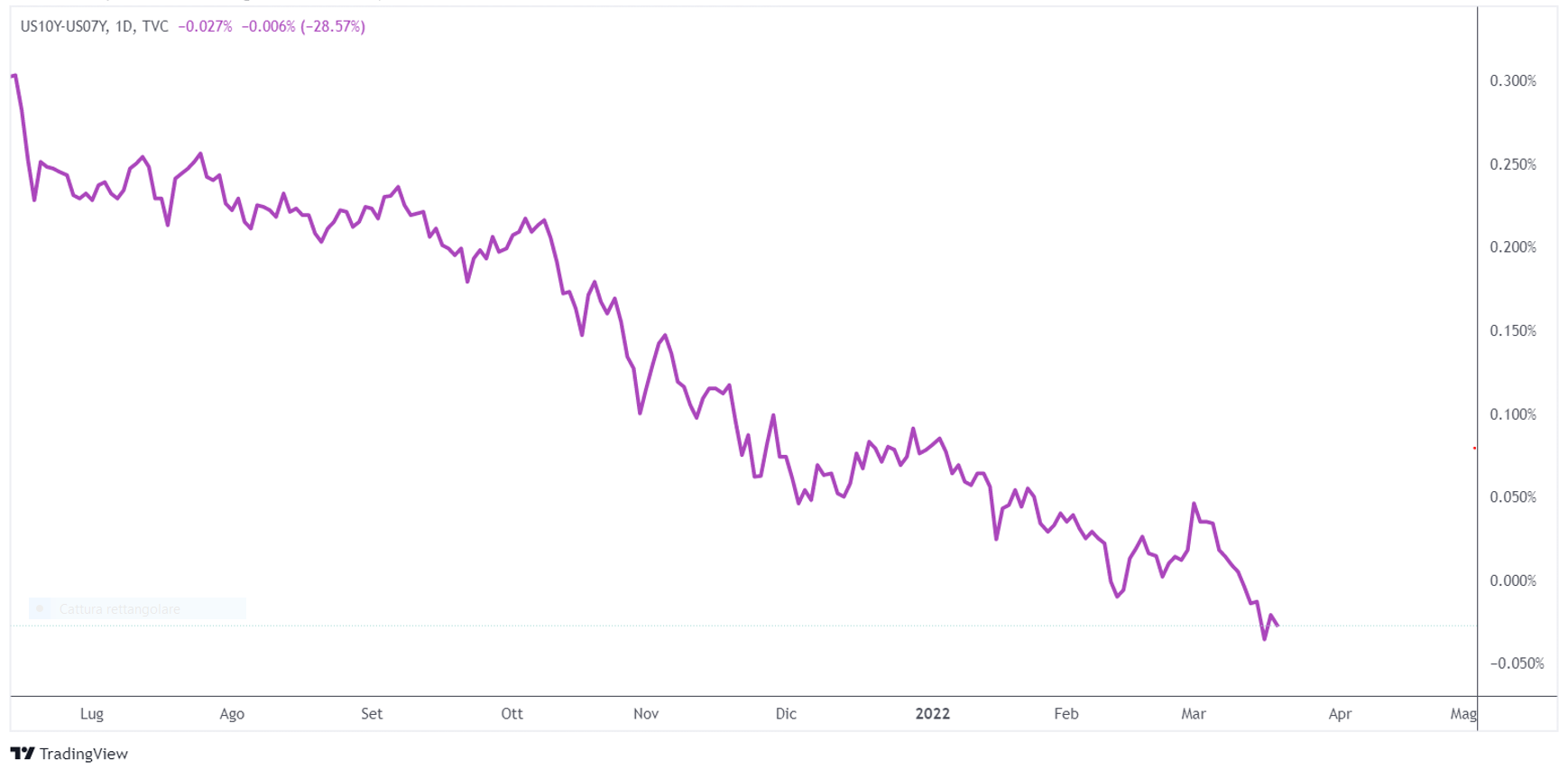 Il mercato obbligazionario non ha creduto alle affermazioni di Powell riguardo alla forza dell’economia. Secondo il presidente della Fed, la probabilità che l’economia scivoli in una recessione non sono particolarmente elevate. La curva dei rendimenti ha cominciato ad invertirsi. Solitamente l’inversione della curva comincia dalla “pancia” (tra i 3 e i 7 anni). Sono proprio gli spread 10/5 e 10/7 ad essere passati in negativo.
