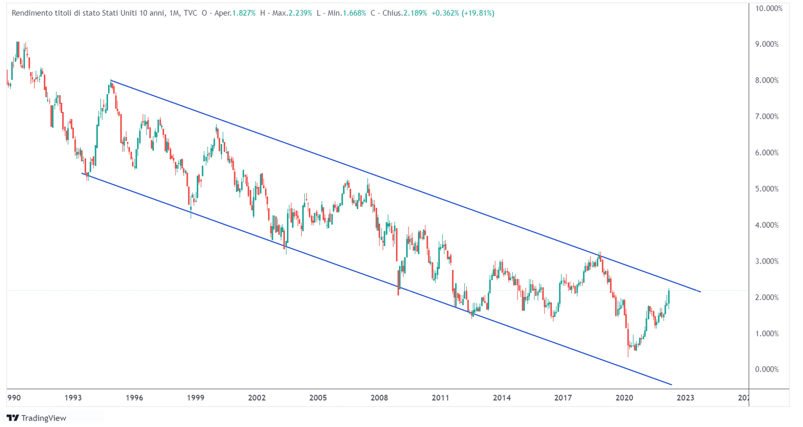 Il decennale americano si sta dirigendo verso la trendline superiore di un canale in cui oscilla da quasi 30 anni!