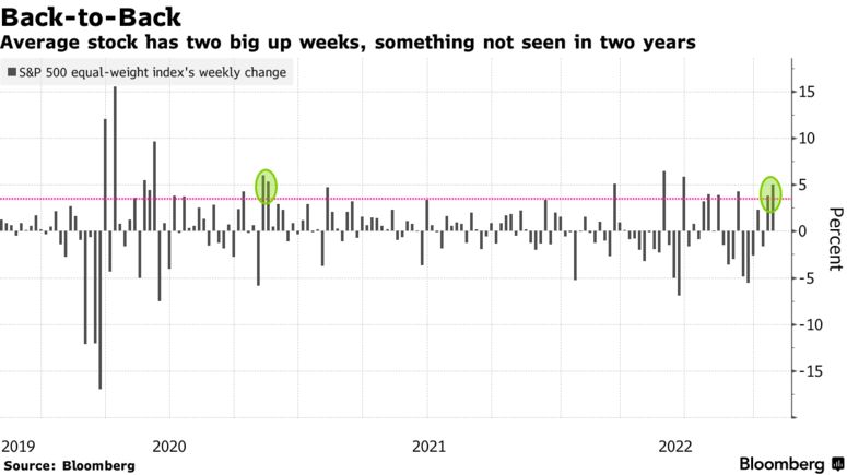 Nonostante le Big Tech abbiano subito le perdite più grandi di sempre dopo i loro utili, il market breadth che ha caratterizzato la salita dell’azionario è stato molto ampio. Una versione “democratizzata” dell’S&P 500 ha registrato uno dei suoi migliori guadagni settimanali consecutivi dal 2009: l’indice S&P 500 Equal Weight, una versione che elimina la distorsione della capitalizzazione di mercato, è salito di oltre il 3,5% per la seconda settimana consecutiva.