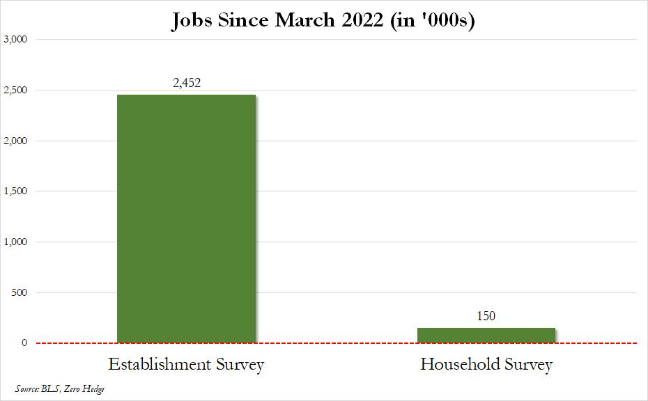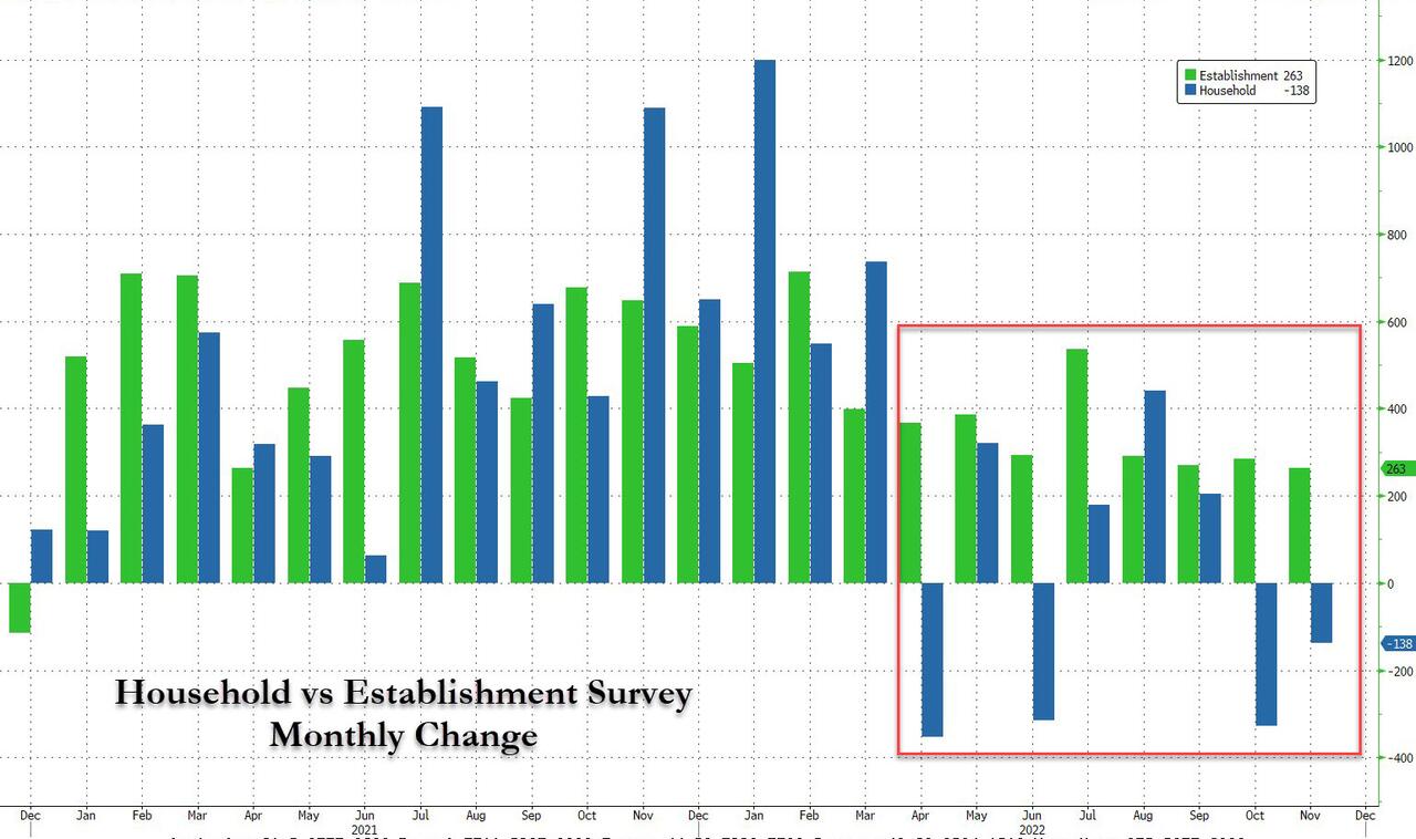 Secondo l’Household Survey c’erano 158,5 milioni di lavoratori occupati nel marzo 2022 e 158,6 milioni nell’ottobre 2022, con un aumento di appena 150.000. Nello stesso periodo, l’Establishment Survey, che fornisce la lettura headline più seguita dal mercato, è aumentato di 2,5 milioni.