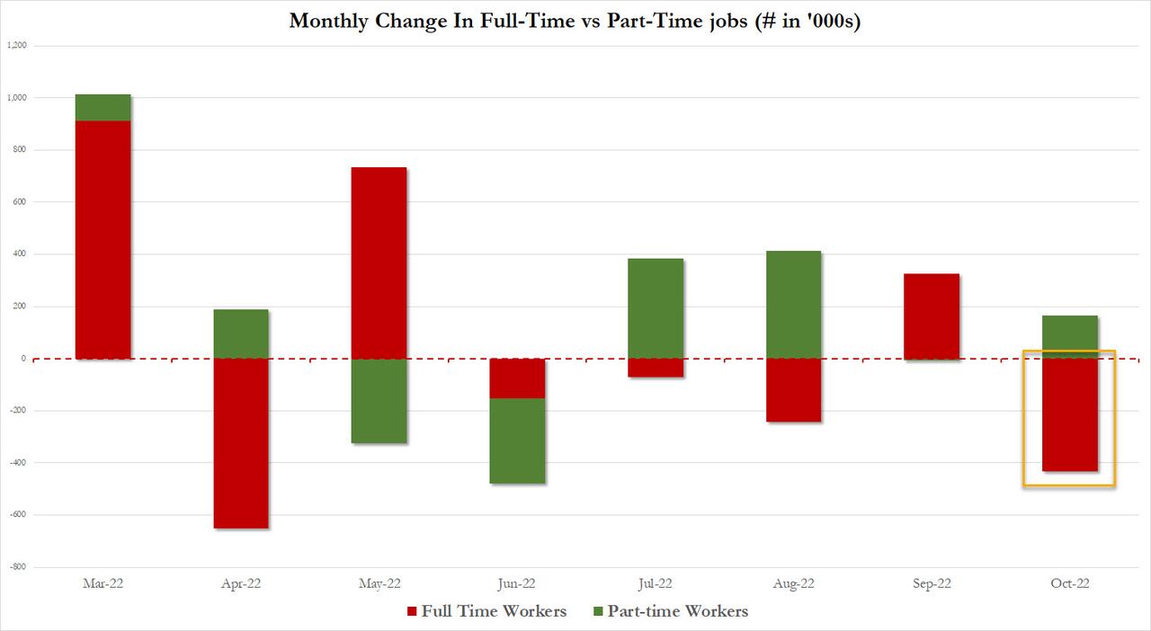 Scavando ancora più a fondo nell’indagine sulle famiglie, scopriamo che il crollo dell’occupazione di ottobre è stato il risultato di un calo massiccio dei posti di lavoro a tempo pieno compensato da un modesto aumento dei posti di lavoro part-time.