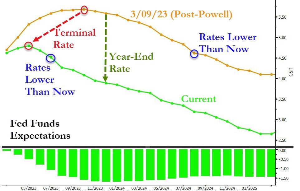 Infine, le aspettative di cambio dei tassi hanno oscillato violentemente in modo accomodante e aggressivo per tutta la settimana, ma sono drammaticamente più accomodanti rispetto a prima del fallimento di SVB. Il tasso terminale ora è scontato a maggio ed entro la fine dell’anno i tassi dovrebbero essere inferiori di 76 punti base.
