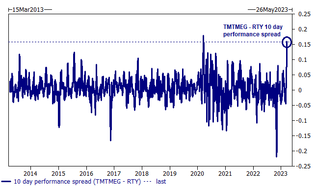 La sovraperformance della tecnologia mega-cap rispetto alle small cap è stata praticamente senza precedenti. Nelle ultime 10 sessioni, il paniere di Goldman Sachs di azioni tecnologiche mega-cap è aumentato del 6,2% mentre il Russell 2000 è sceso del 9,8%. Questo spread del 16% è il secondo più alto di tutti i tempi.