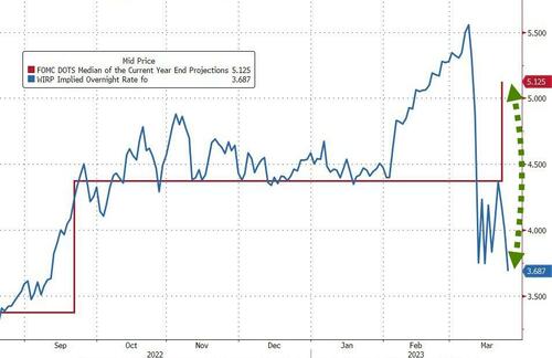 Il mercato è decisamente più accomodante rispetto al dot plot della Fed per quanto riguarda la posizione dei tassi a fine anno, con ben 150 punti base di differenza. Il mercato sta chiaramente proiettando un peggioramento della crisi finanziaria e/o una recessione con atterraggio duro.