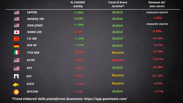 L’indice S&P 500 è salito di oltre l’1% per la seconda settimana consecutiva, segnando nuovi massimi storici. Nel frattempo, il rendimento dei Treasury a 10 anni è sceso al 4,17%, e il dollaro ha registrato una perdita settimanale superiore all’1%, interrompendo una serie di otto settimane consecutive di guadagni. Bitcoin è tornato sotto la soglia chiave dei 100.000 dollari. Anche l’oro e il petrolio hanno chiuso in rosso.