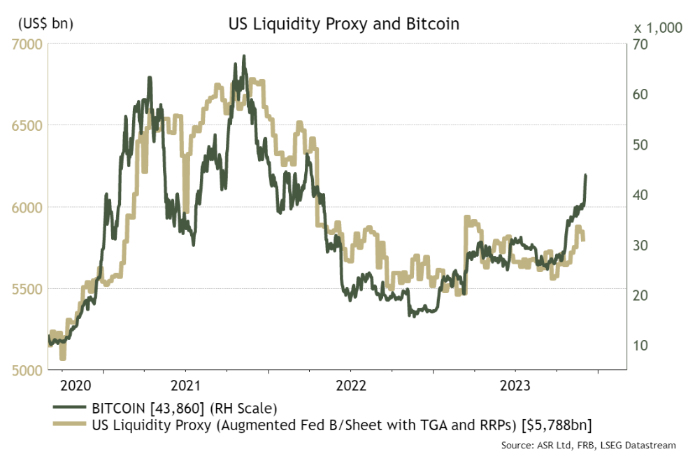 Bitcoin si trova ancora ben al di sotto del suo record di quasi 69.000 dollari stabilito nel 2021. Il rally che lo ha portato a raggiungere quel massimo si è sviluppato insieme al massiccio afflusso di liquidità nel sistema per contrastare gli effetti della pandemia. Il prezzo di Bitcoin mostra una correlazione estremamente elevata con la liquidità in circolazione nei mercati statunitensi.